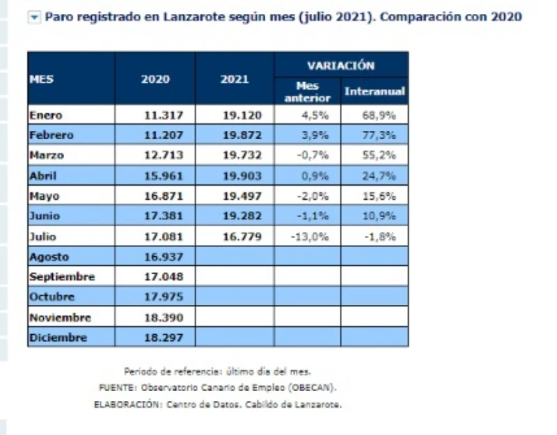 Tinajo tiene 55 parados menos, pasando de 637 a 582. Y, por último, Yaiza finalizaba el mes pasado con 1.701 parados frente a los 2.070 de junio, lo que supone 369 parados menos.