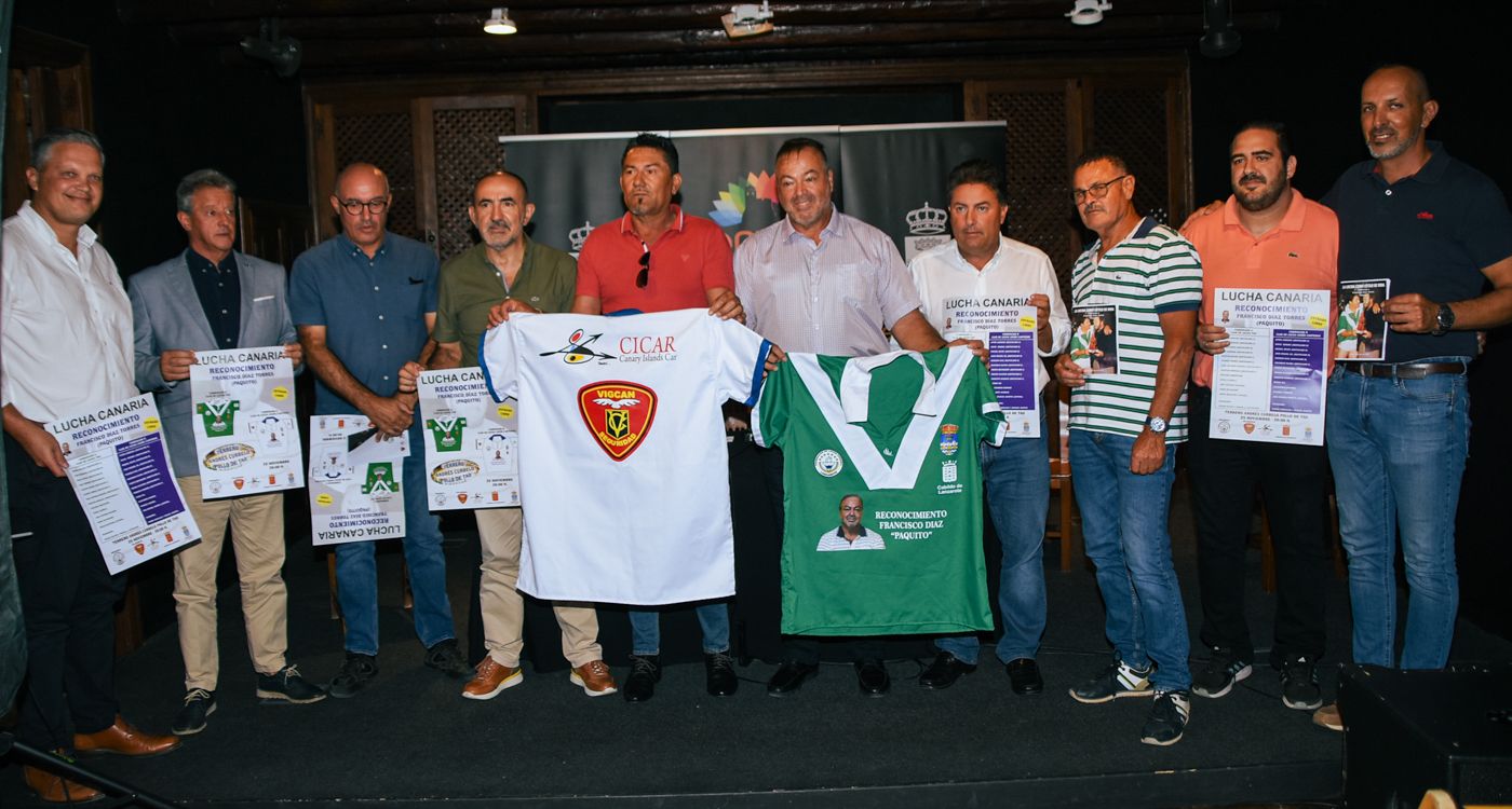 “Ojalá haya muchos Paquitos para seguir impulsando la lucha canaria”, fue el deseo más expresado por los que intervinieron esta mañana en la rueda de prensa, presidida por el concejal de Deportes de Teguise, Gerardo Rodríguez; el consejero del Deportes del Cabildo de Lanzarote, Alfredo Mendoza; el presidente de la Federacioìn de Lucha Canaria de Lanzarote, Sebastiaìn Lemes, así como el principal promotor de este homenaje, el presidente de los aìrbitros de Lucha Canaria, Joseì Javier Hernaìndez, y el periodista y estudioso de la lucha canaria, Manuel Garciìa Deìniz; y a la que asistieron además, los patrocinadores del evento, como CICAR y Viggan Seguridad, entre otros muchos compañeros el Club de Lucha Tao y del mundo de la lucha lanzaroteña.
