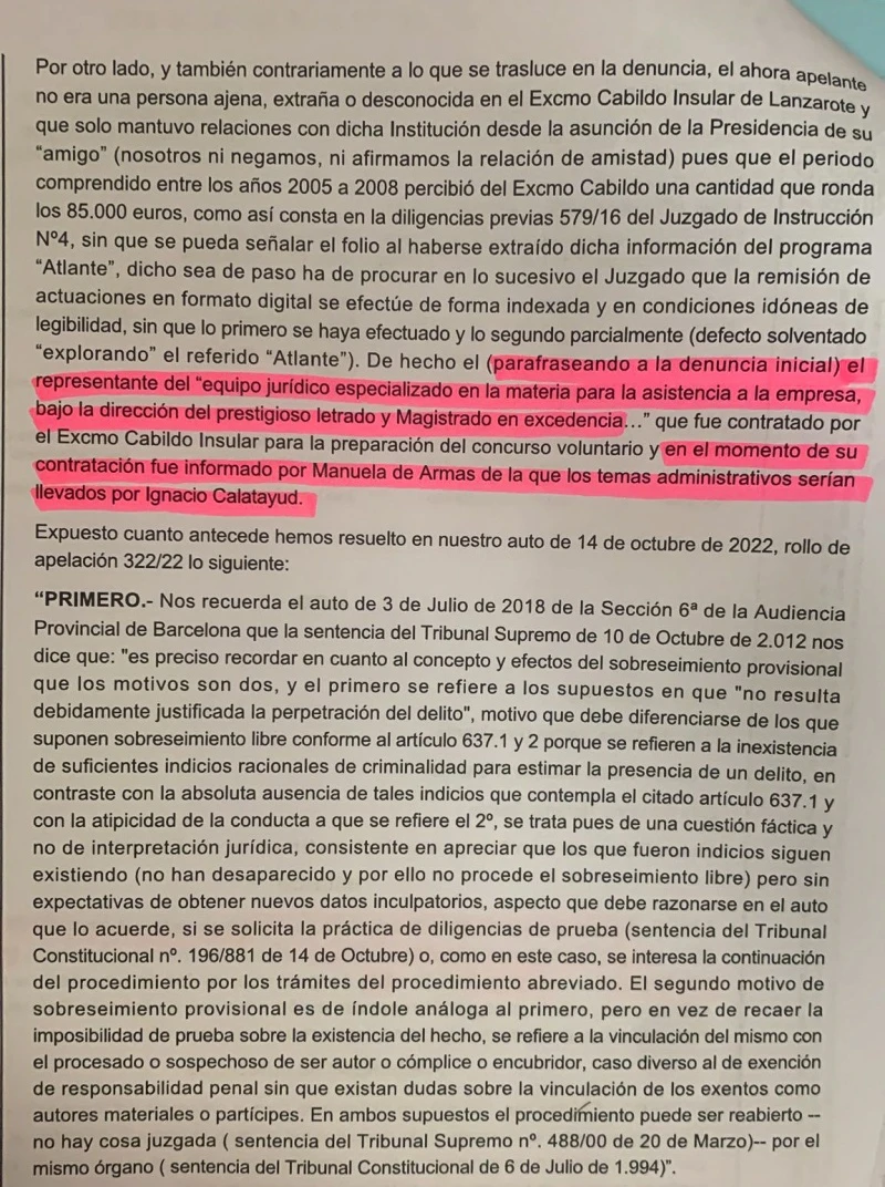 Por otro lado, en el mismo auto, la Audiencia Provincial confirma que “el representante del ‘equipo jurídico especializado en la materia para la asistencia a la empresa, bajo la dirección del prestigioso letrado y Magistrado en excedencia...’ (en referencia al juez Cobo Plana) que fue contratado por el Excmo. Cabildo Insular para la preparación del concurso voluntario y en el momento de su contratación fue informado por Manuela de Armas de la que los temas administrativos serian llevados por Ignacio Calatayud".